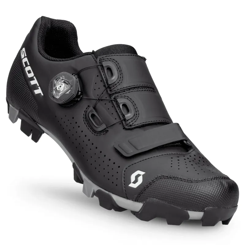 The SCOTT MTB Team BOA® shoe offers great comfort and adjustability. It combines excellent response with slipper-like comfort at an affordable price. The shoe features a sleek, asymmetric, conforming microfiber upper and a close-fitting, adaptive fit pattern with a BOA® IP1 Fit System at the top. Combined with a lower anatomic fit strap, it articulates and adapts to the foot shape. The ErgoLogic insole features arch support and a metatarsal button. The injection composite sole has a stiffness index of 8.